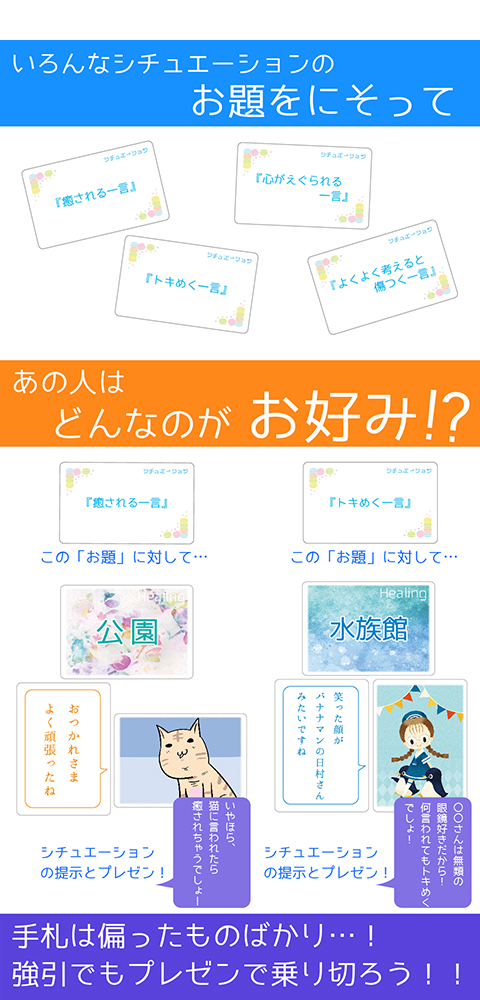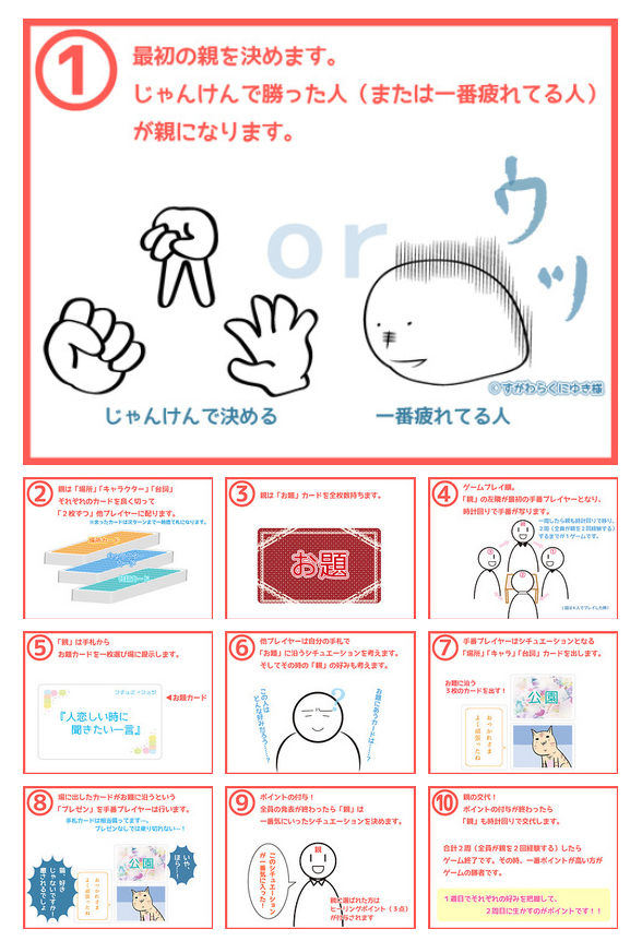 親が提示した「お題」にそったシチュエーションを提示・プレゼンを行って勝利を得ましょう!